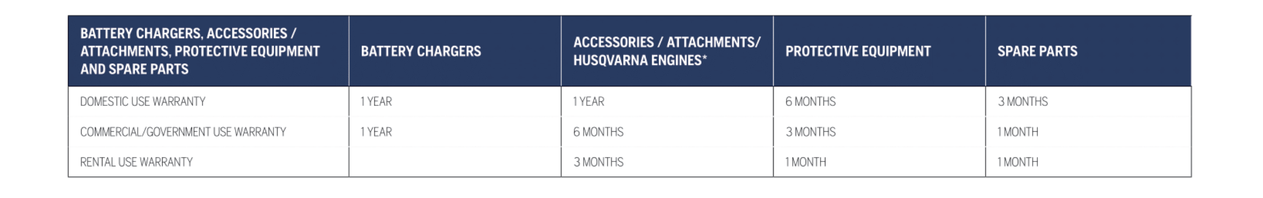 To extend the standard warranty of Battery products to a total of 5 years the battery product must be serviced annually by an authorised Husqvarna Servicing Dealer.